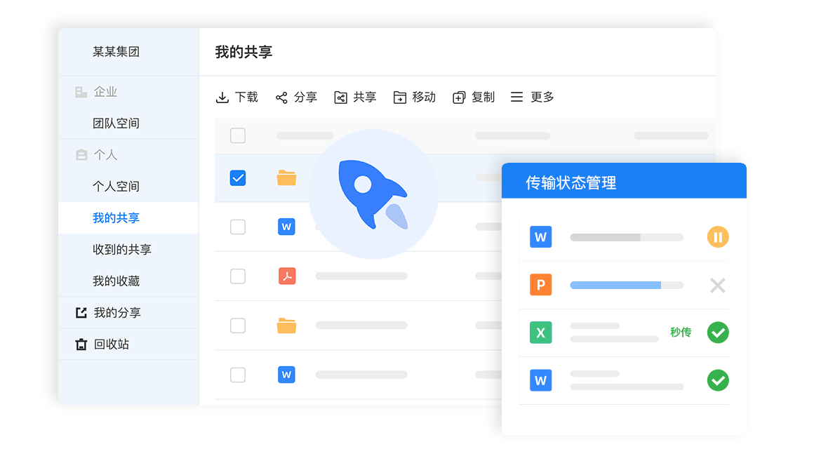 提供批量上传、文件夹上传、传输暂停、取消等传输状态管理功能。